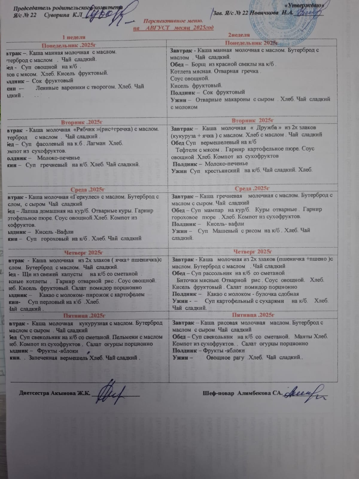 Десятидневное меню на Август 2025год » №22 бөбекжай-бақшасы