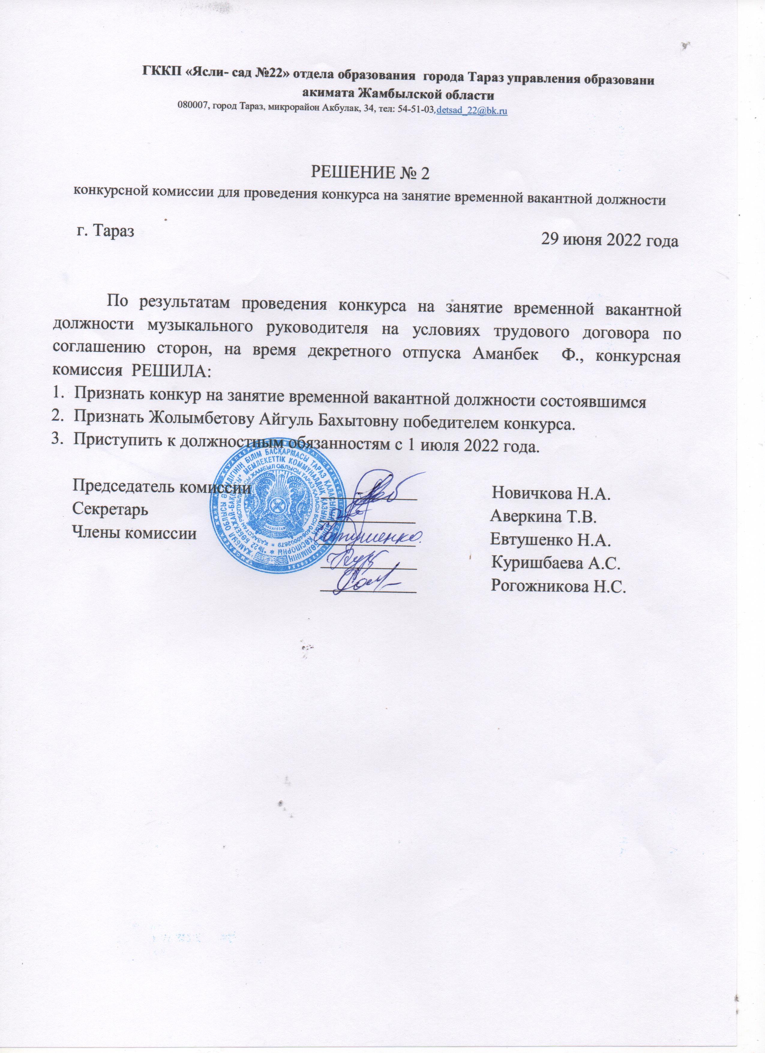 29 июнь 2022 0 1 2 3 4 5 РЕШЕНИЕ КОНКУРСНОЙ КОМИССИИ НА ЗАНЯТИЕ ВРЕМЕННО ВАКАНТНОЙ ДОЛЖНОСТИ МУЗЫКАЛЬНОГО РУКОВОДИТЕЛЯ