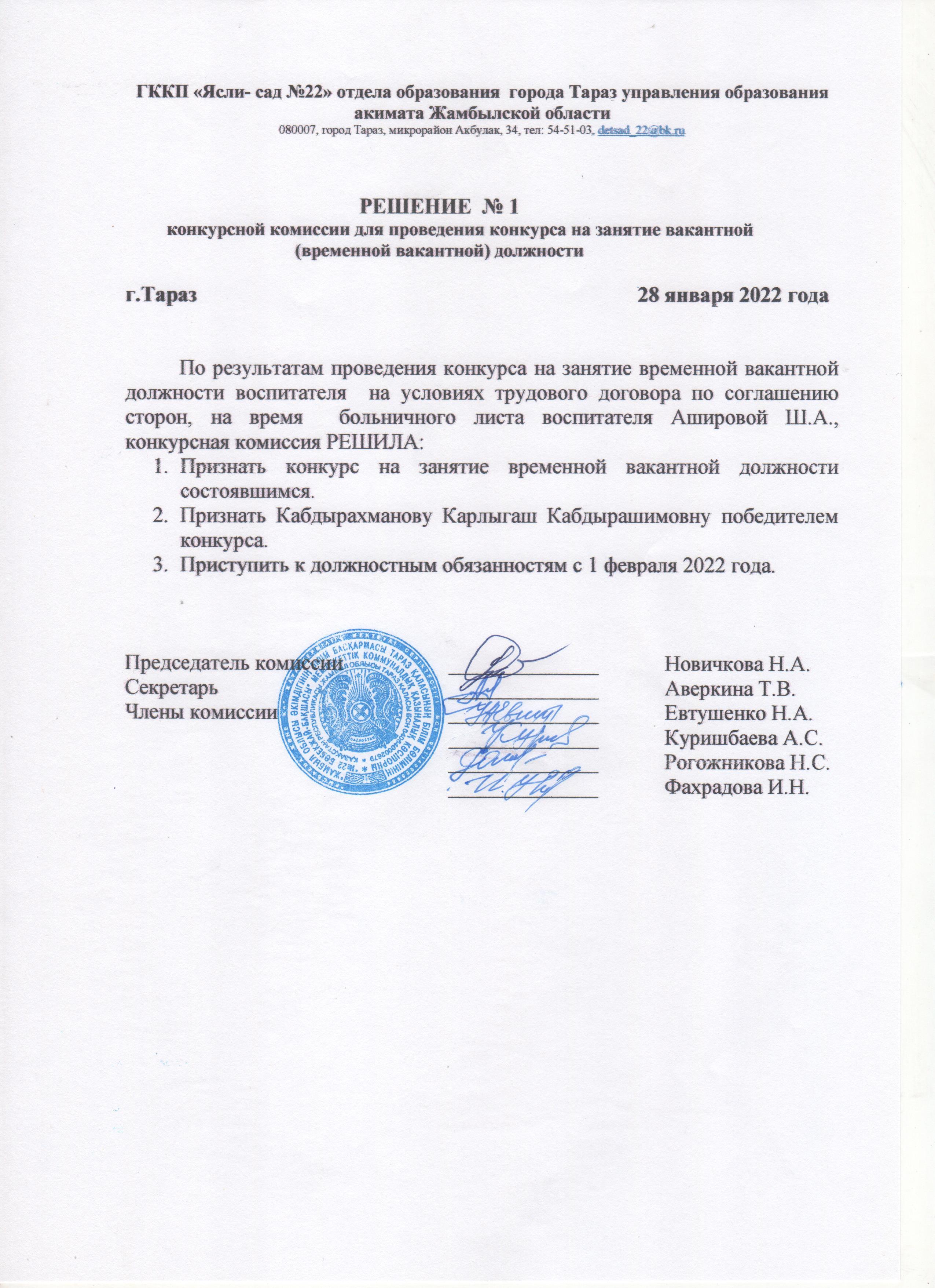 28 январь 2022 0 1 2 3 4 5 РЕШЕНИЕ № 1 конкурсной комиссии для проведения конкурса на занятие временной вакантной должности