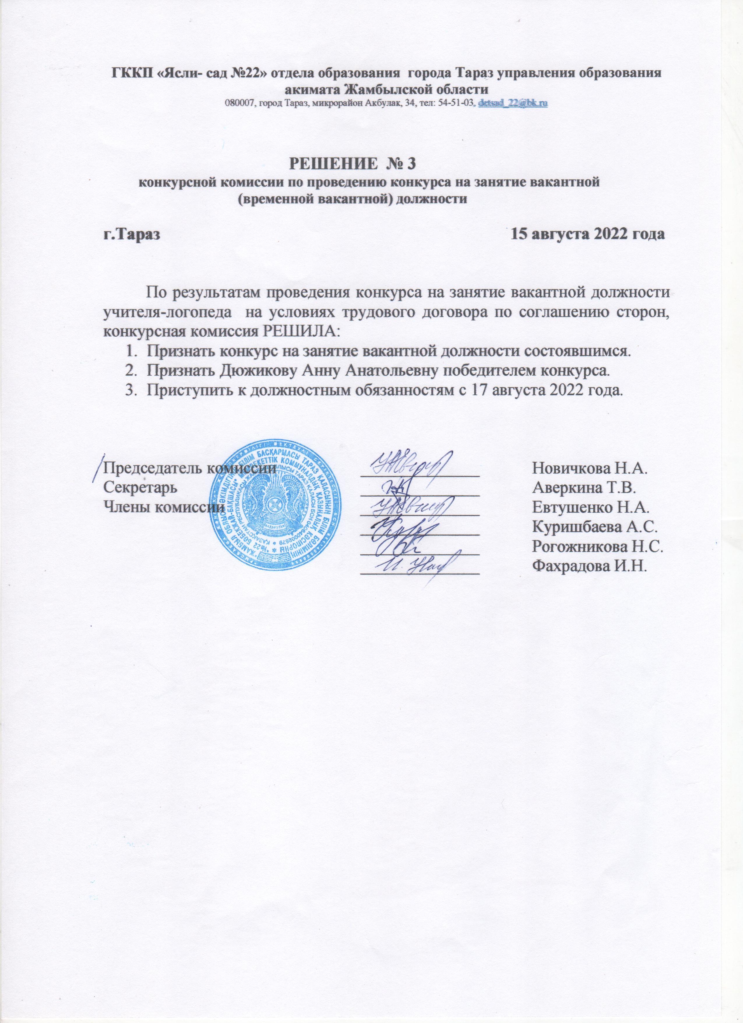 15 август 2022 0 1 2 3 4 5 РЕШЕНИЕ КОНКУРСНОЙ КОМИССИИ НА ЗАНЯТИЕ ВРЕМЕННО ВАКАНТНОЙ ДОЛЖНОСТИ ЛОГОПЕДА