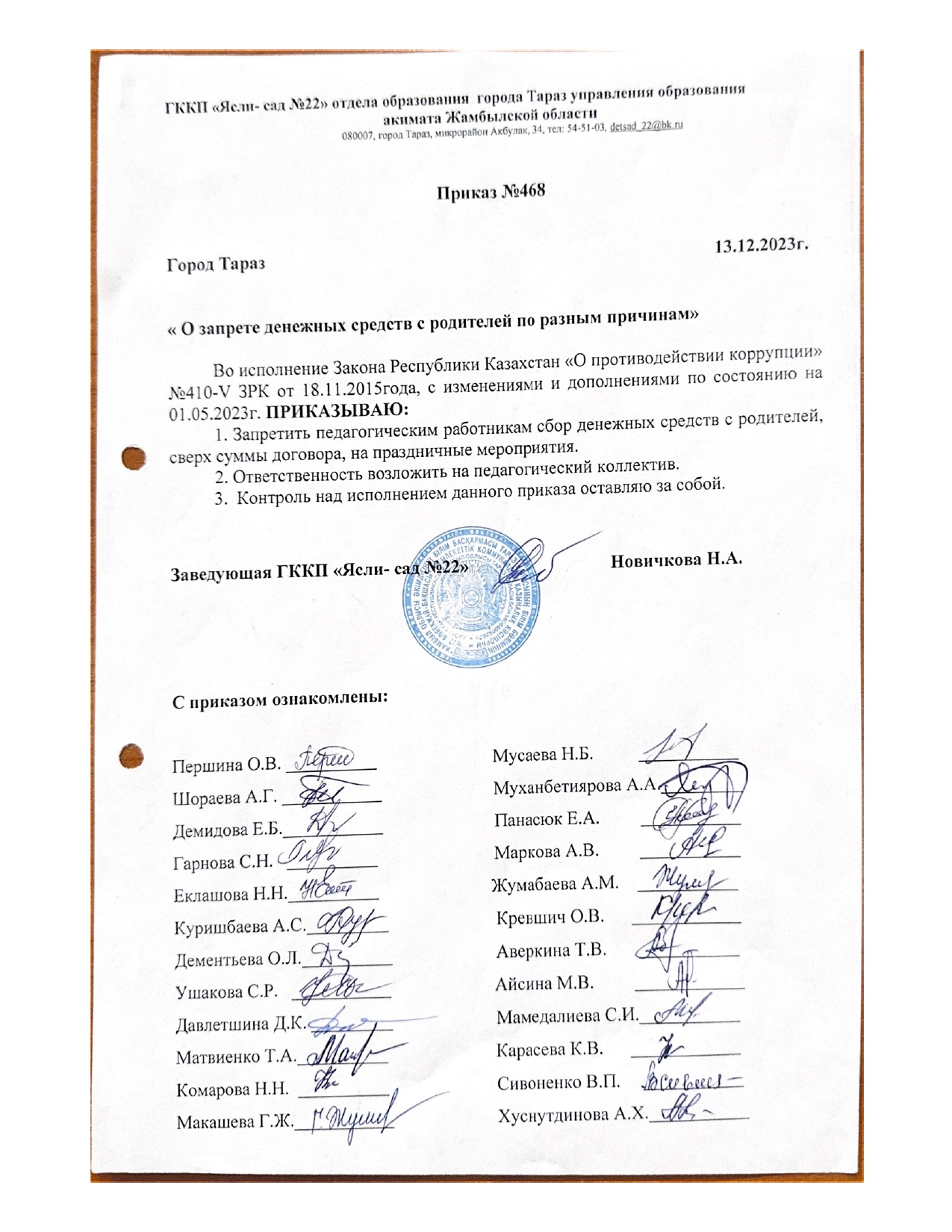 Приказ о запрете сбора денежных средств с родителей по разным причинам » №22 бөбекжай-бақшасы
