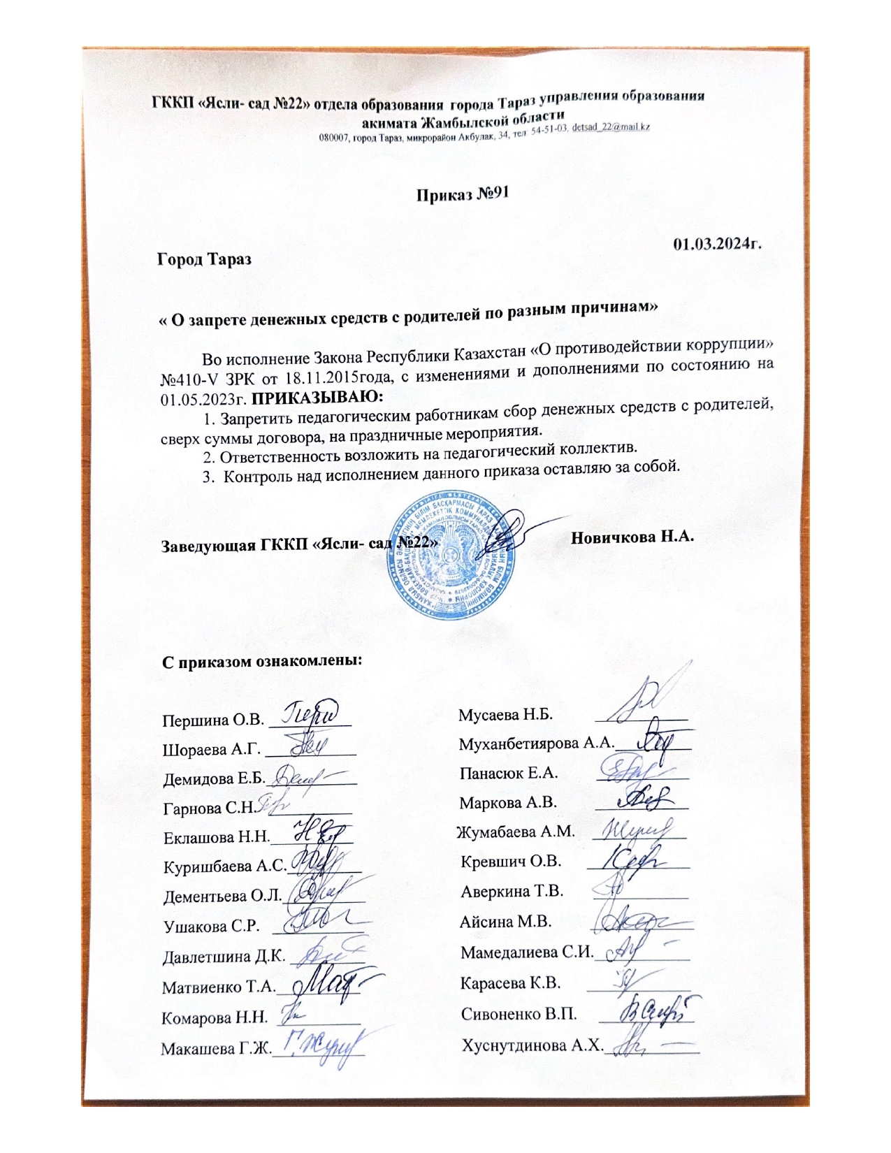 Приказ о запрете сбора денежных средств с родителей по разным причинам » №22 бөбекжай-бақшасы