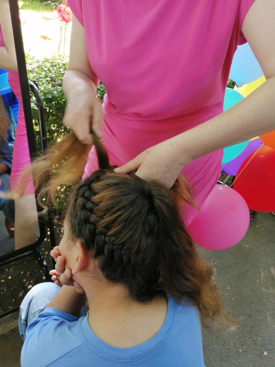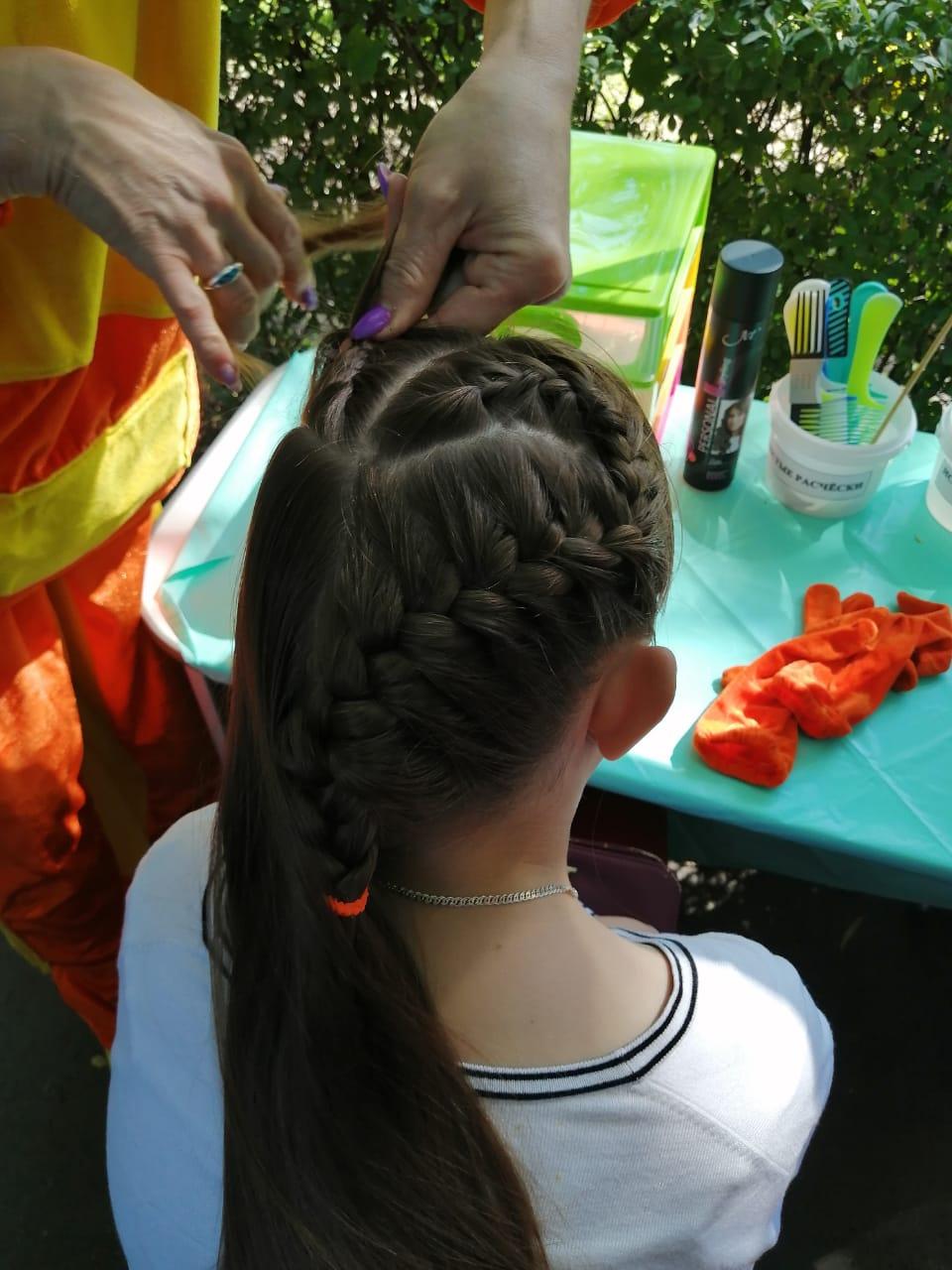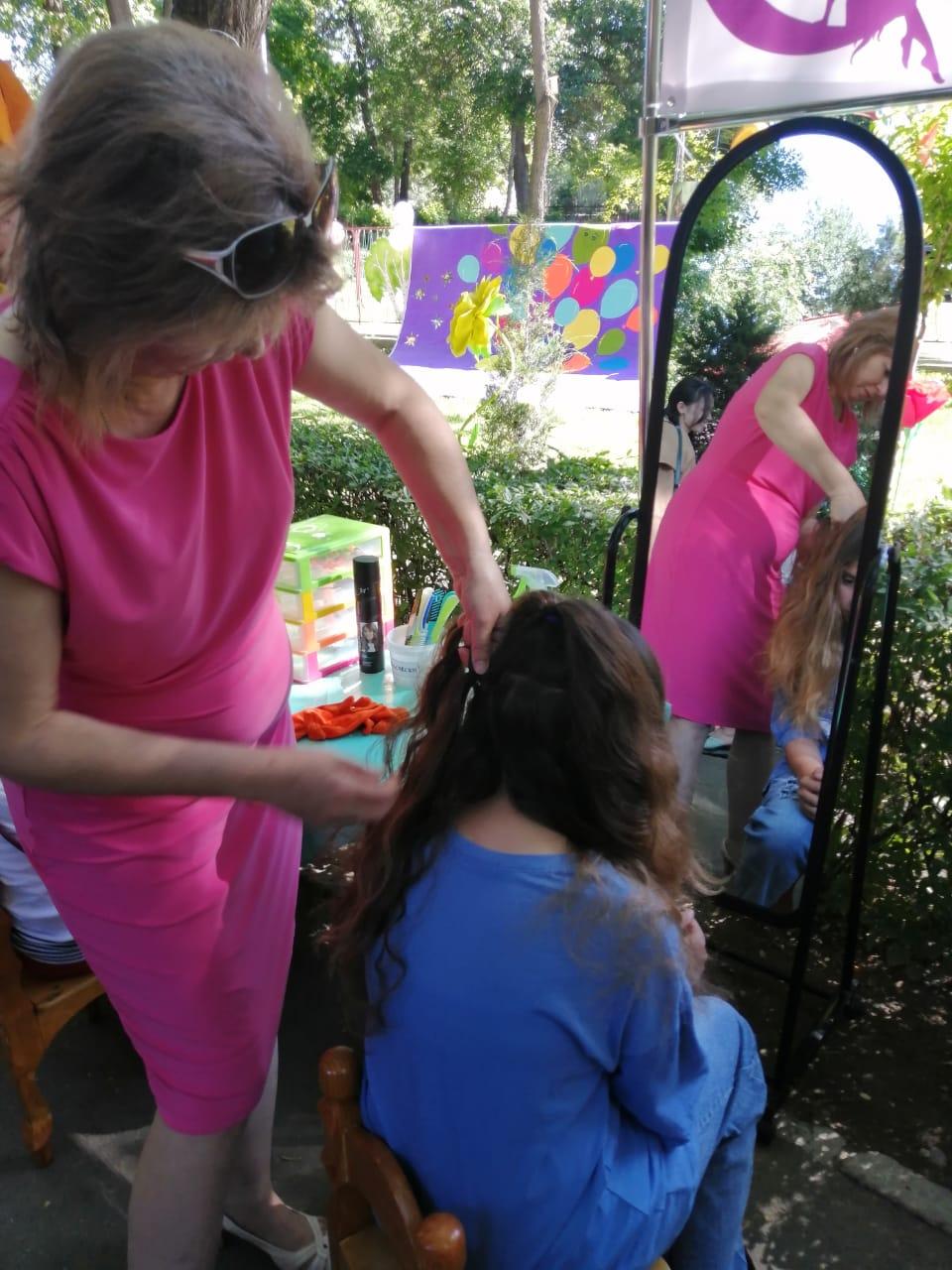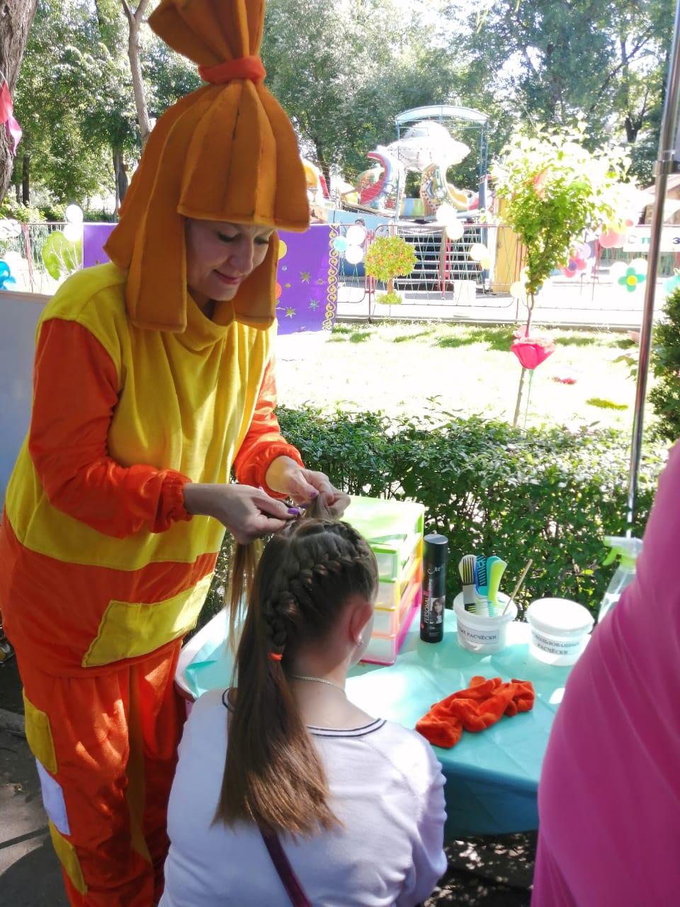 Сегодня- 1 июня 2022г -в честь празднования Международного Дня защиты детей наш коллектив ясли-сада принял участие в городском мероприятии к этой дате. Наши волшебные персонажи Фиксик и Нолик приглашали гостей парка Рыскулова в творческую мастерскую причесок Салона красоты "Феечки". Всем желающим гостям были предложены всевозможные причёски с плетением косичек, хвостиков.