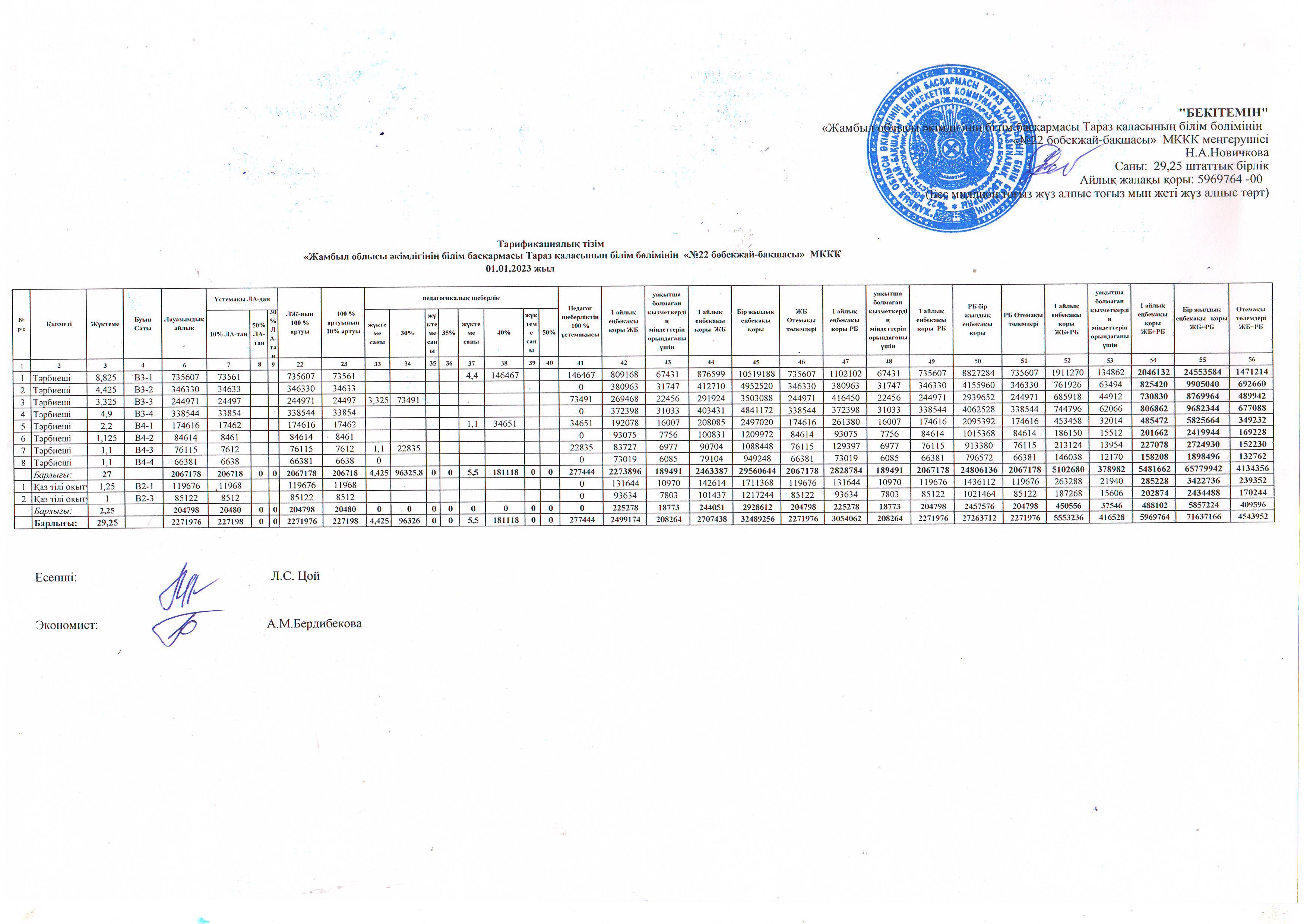 Бекітілген штат кестесі және Еңбекақыны тарифтеу 01.01.2023 » №22 бөбекжай-бақшасы