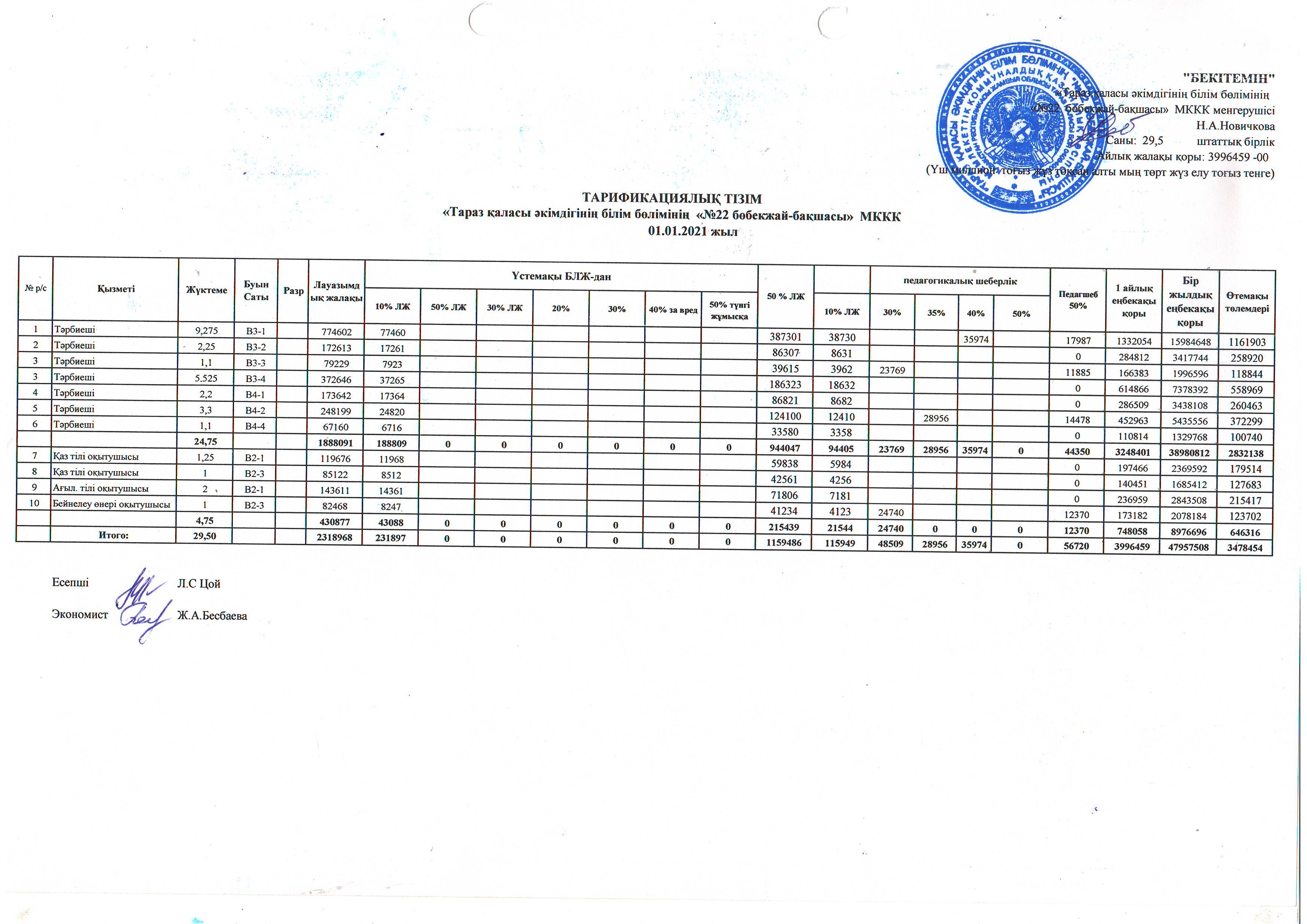 Бекітілген штат кестесі және Еңбекақыны тарифтеу 01.01.2021 » №22 бөбекжай-бақшасы
