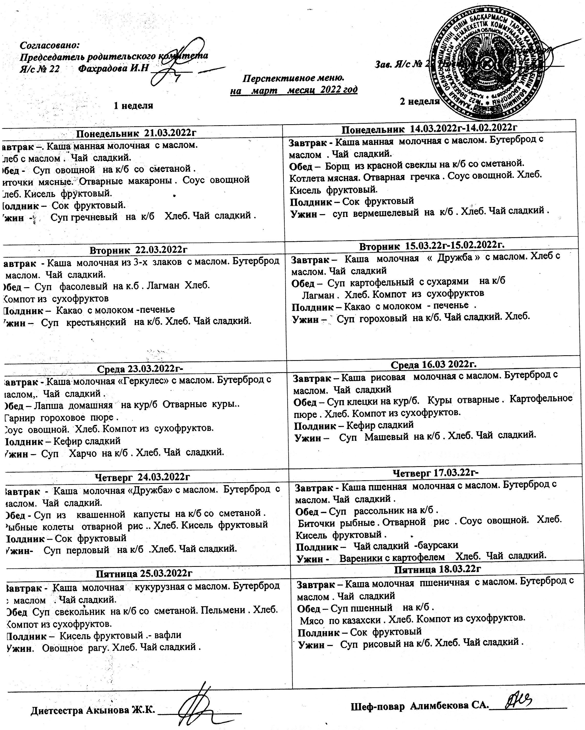 Перспективное МЕНЮ на МАРТ 2022г » №22 бөбекжай-бақшасы