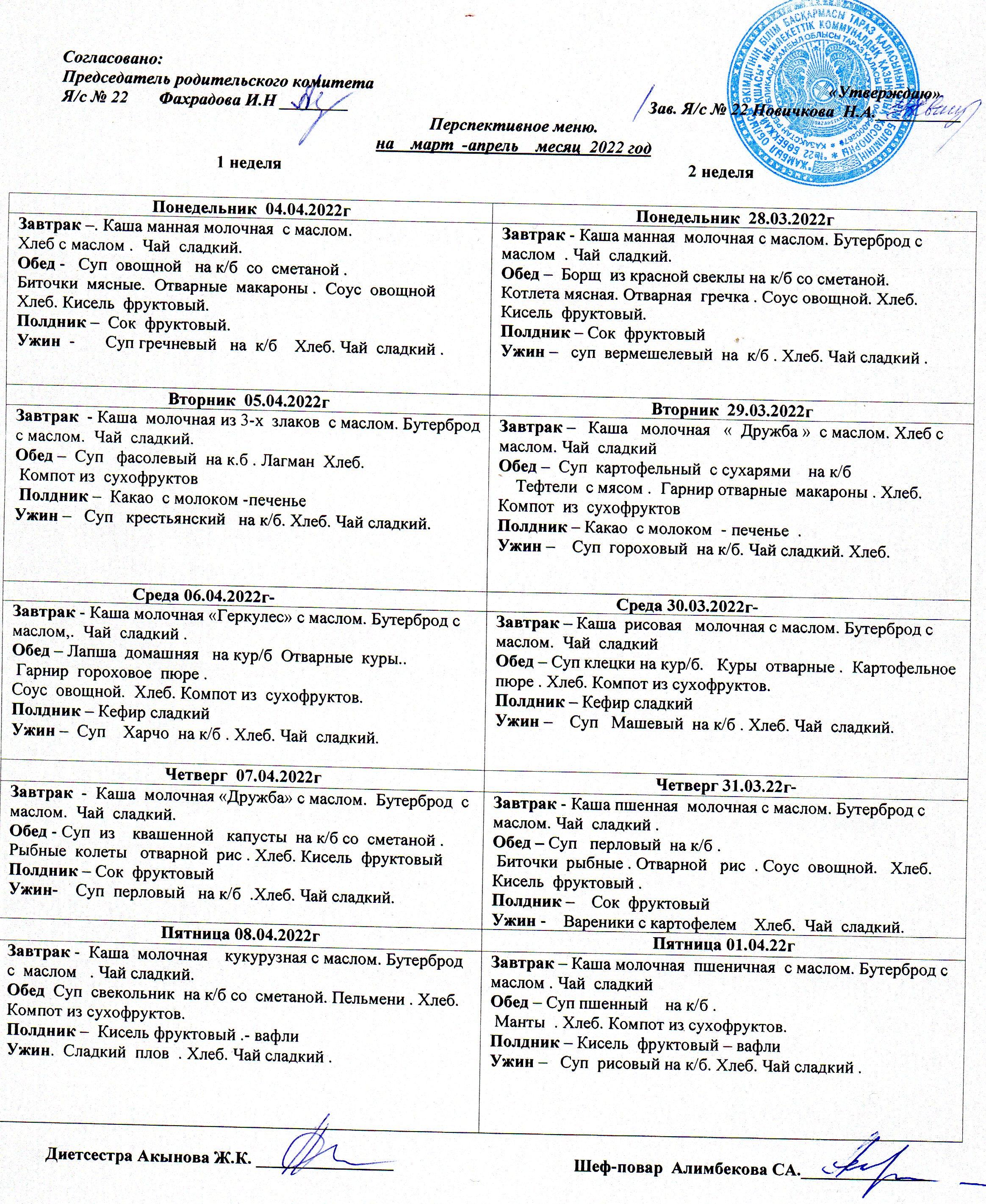 Перспективное меню на апрель 2022 г » №22 бөбекжай-бақшасы