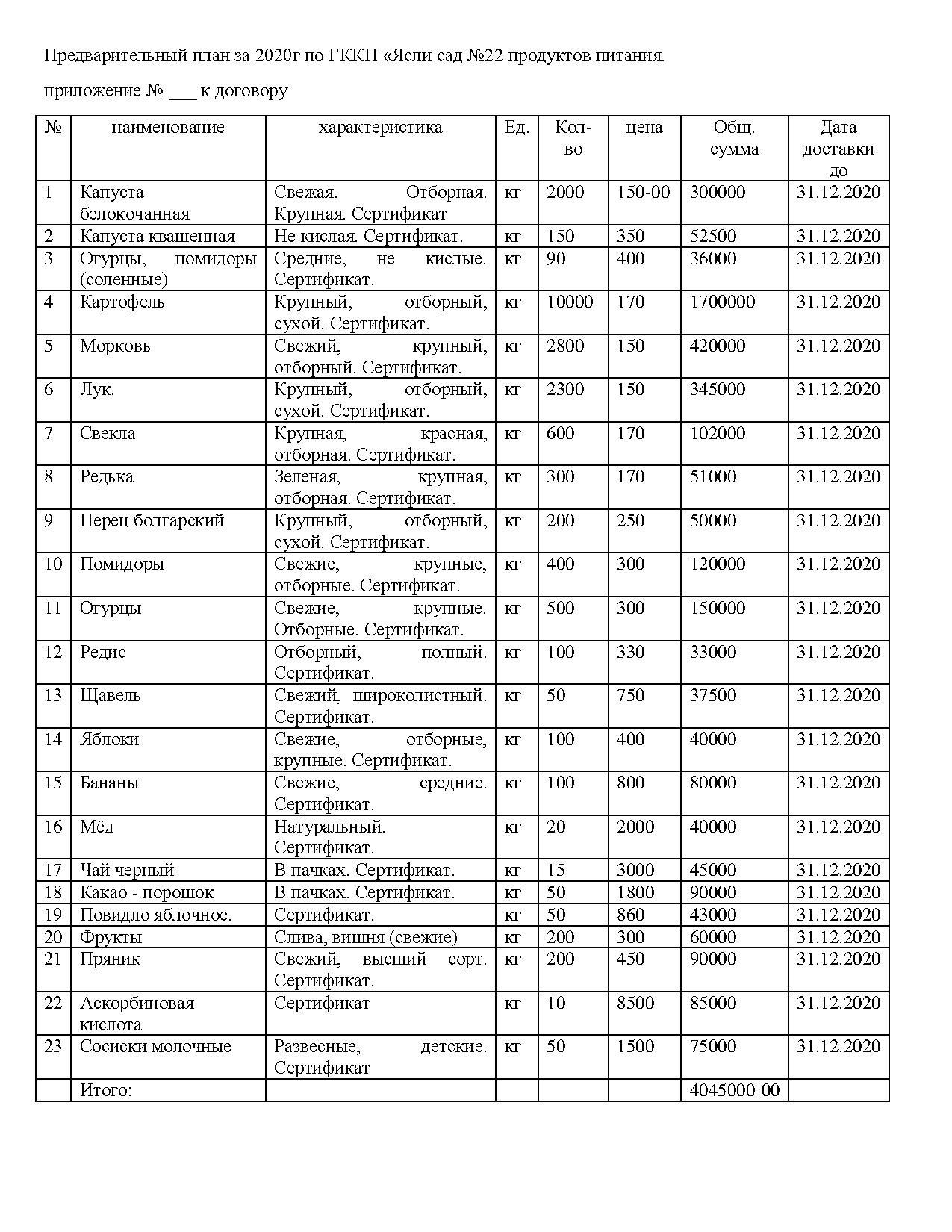 План приобретения продуктов питания на 2020 год » №22 бөбекжай-бақшасы